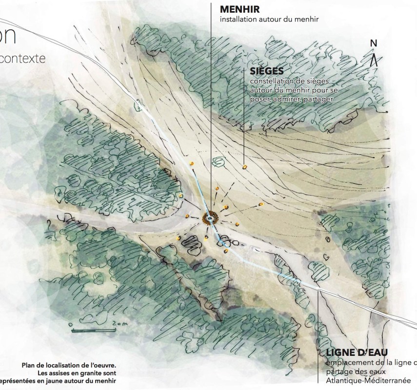 Nous souhaitons intégrer notre oeuvre dans les logiques territoriales en valorisant le patrimoine mégalithique et en soulignant son positionnement sur la ligne de partage des eaux. Cette proposition est une évocation à taille humaine du paysage immense qui entoure le visiteur.