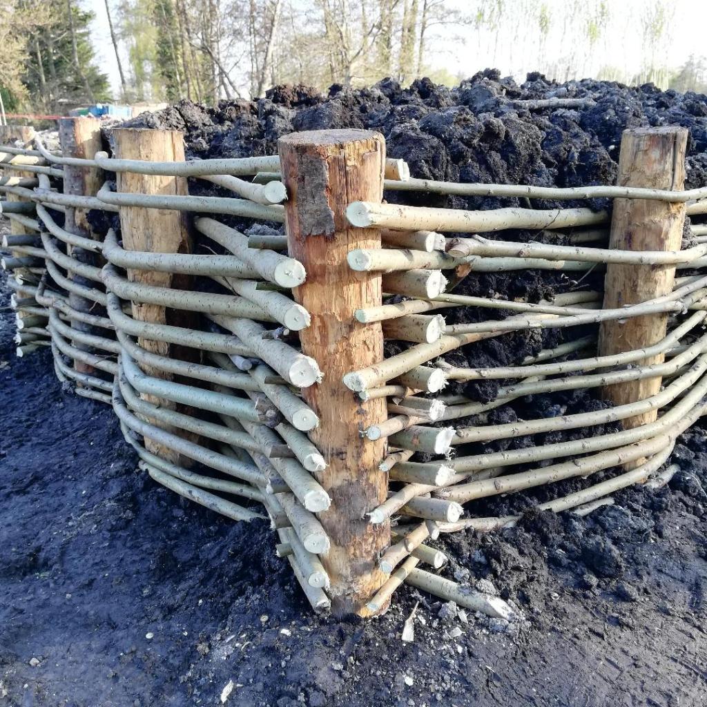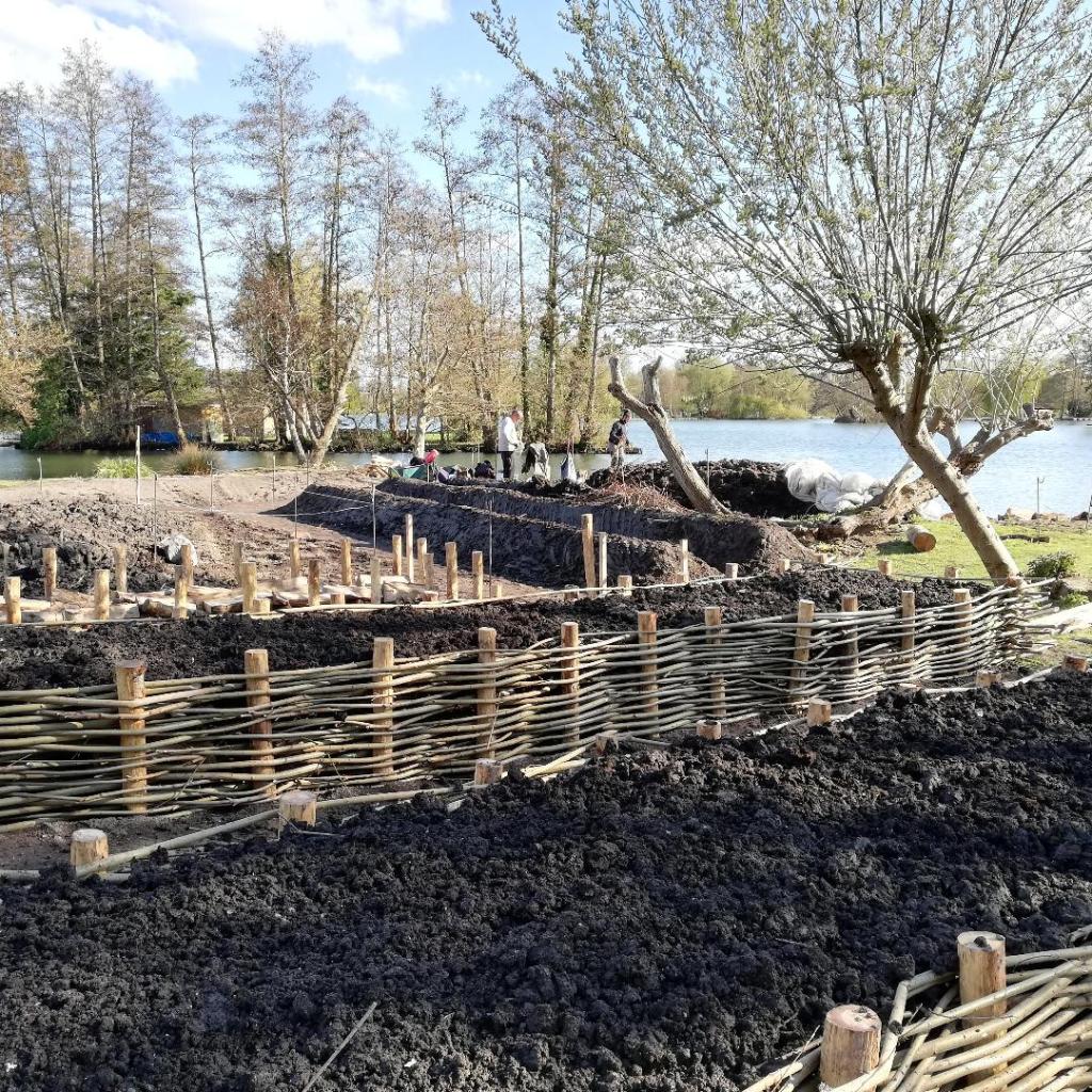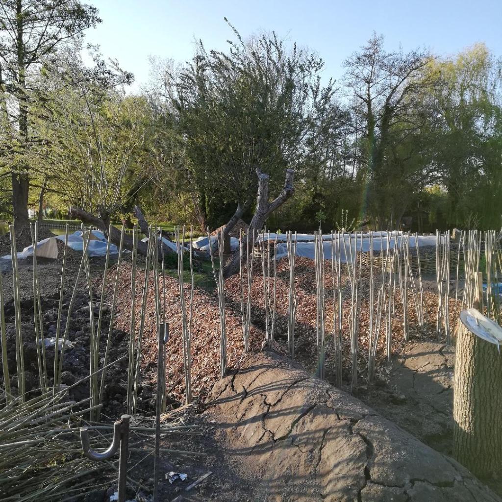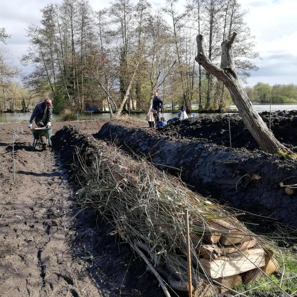 Installation des pieux qui serviront au plessage et disposition des bûches à l’intérieur.Dernière étape, le recouvrement par la terre.Plessage au sol pour accueillir les plantations futures.