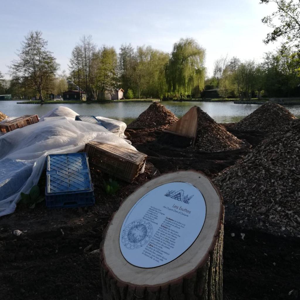 Façonnage des buttes à l’aide de bûches, branchages, terre.Installation des assises.Citronnelle et igname s’immiscent au pied des buttes.