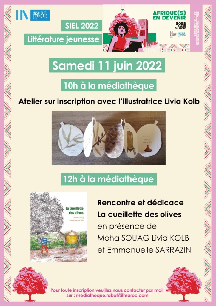 Prochaine rencontre à Rabat (médiathèque de l’Institut français) dans le cadre du Salon International de l’Édition et du Livre : atelier & rencontre avec l’éditrice Emmanuelle Sarrazin et l’auteur Moha Souag