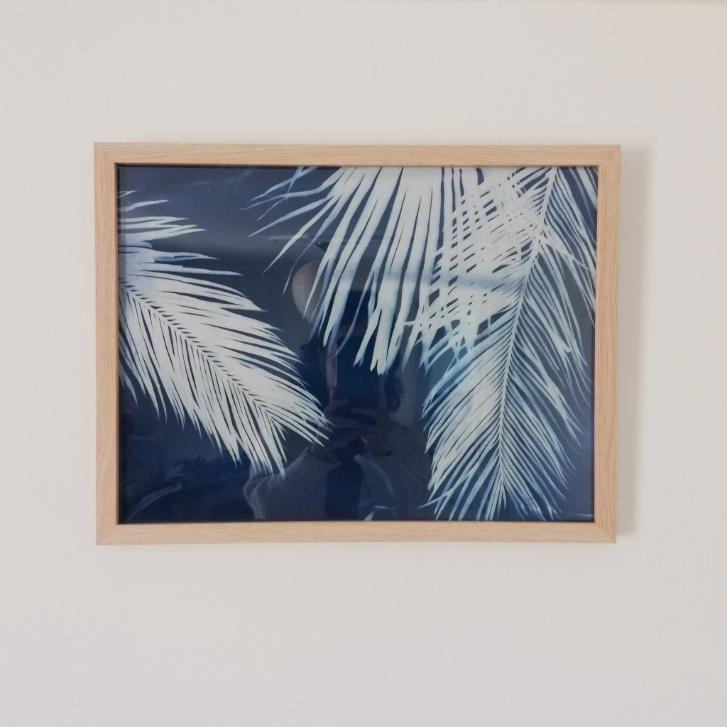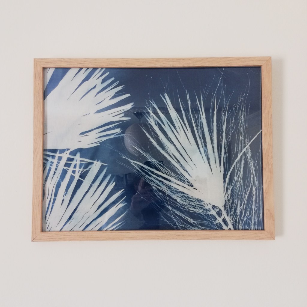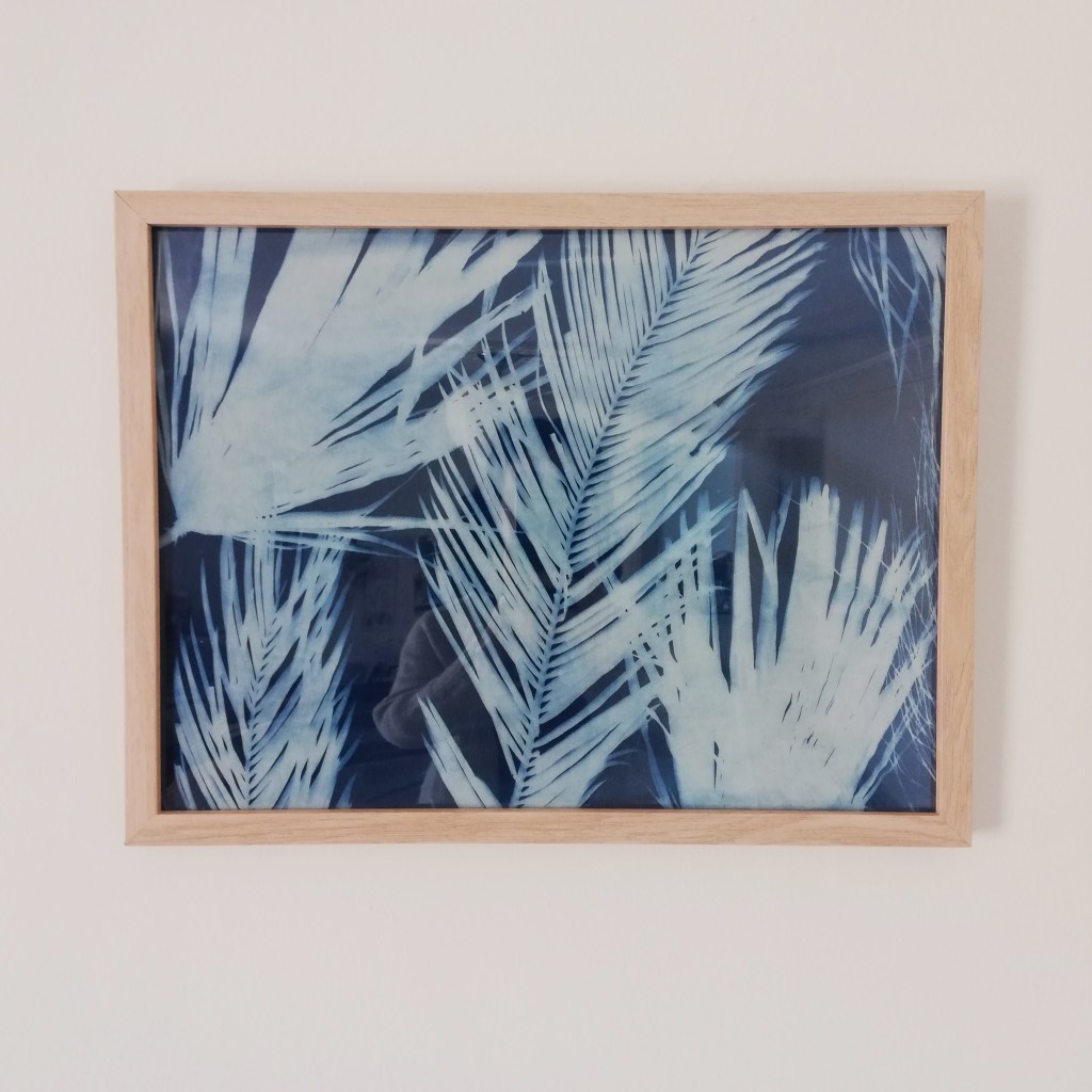 Cyanotype encadré : Cyanotype sur tissu en coton recyclé, impression de feuilles de palmiers et cycas